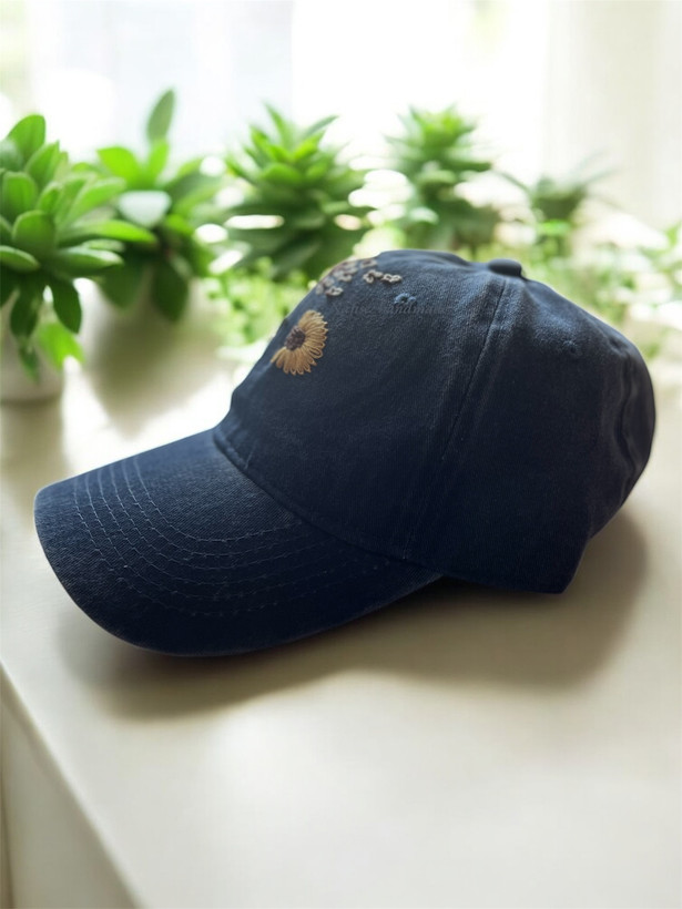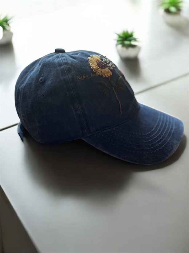 کلاه گلدوزی شده بادست با طرح زیبای آفتابگردان انتخابی خاص و هنری برای استایل های مینیمال.