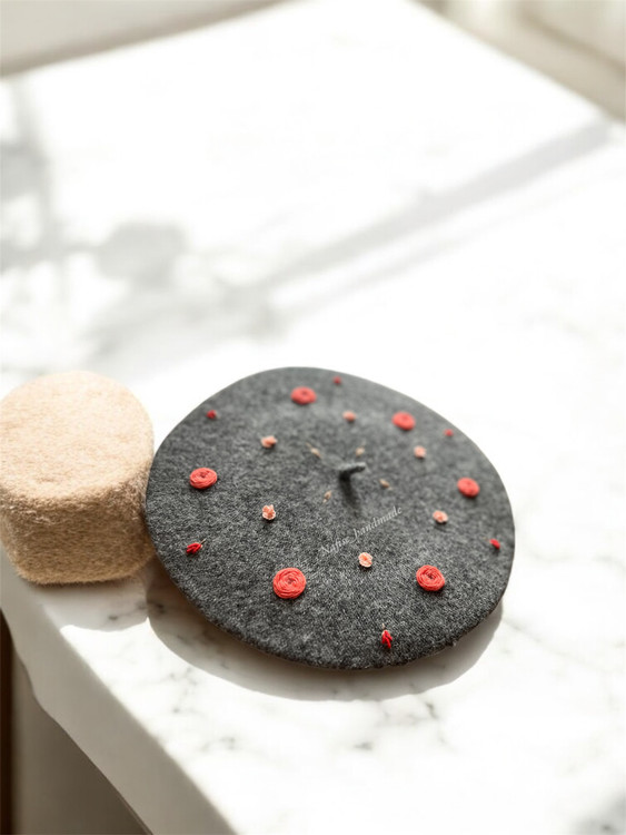 Dark gray wool beret hat with hand-embroidered orange and pink flowers
