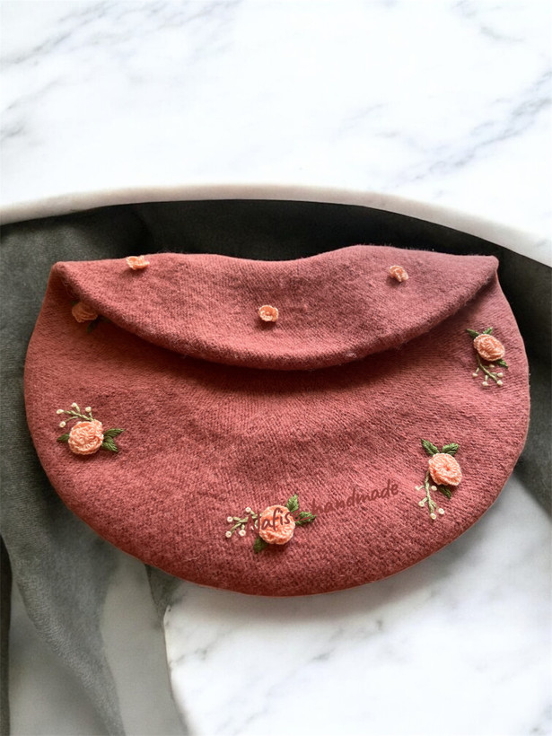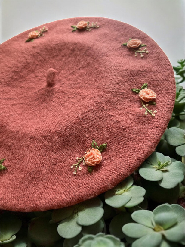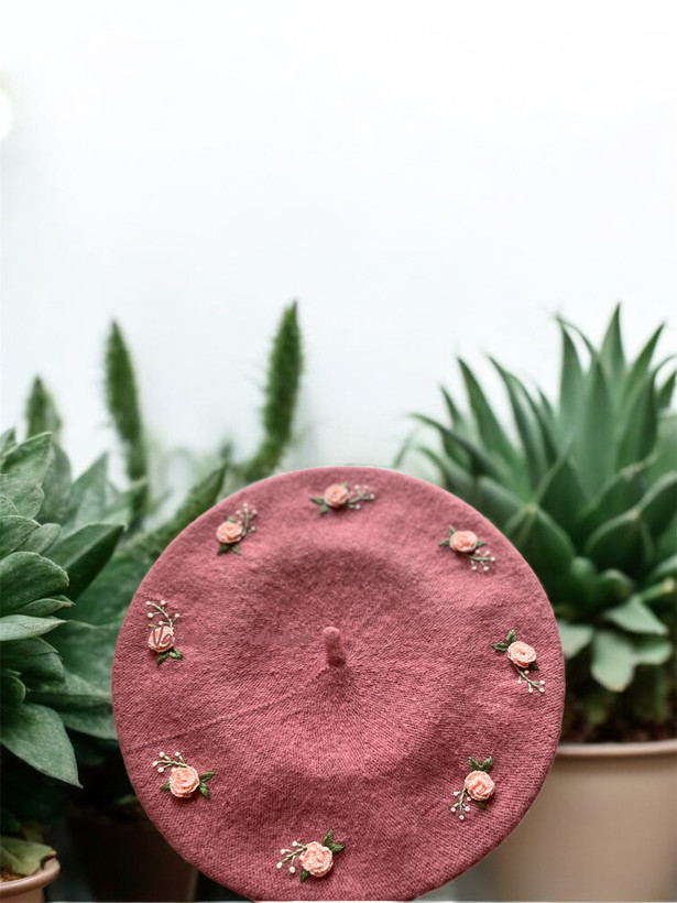 کلاه برت دستدوز زنانه با گلدوزی گلهای رز غنچه