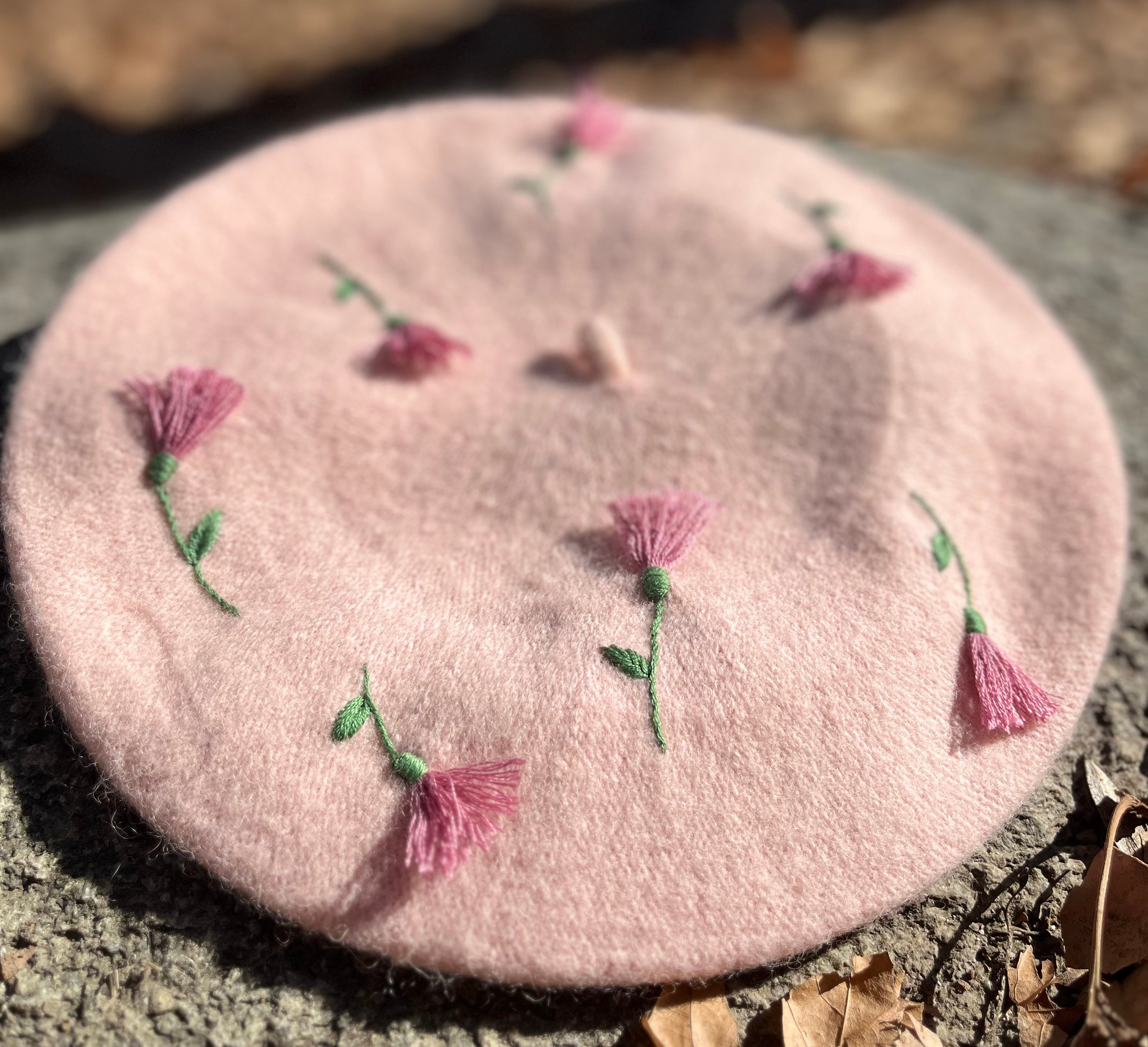 کلاه برت صورتی دست دوز با گلدوزی گل های شیپوری| کلاه دخترانه هنری و خاص۸۲۵٬۰۰۰ تومان