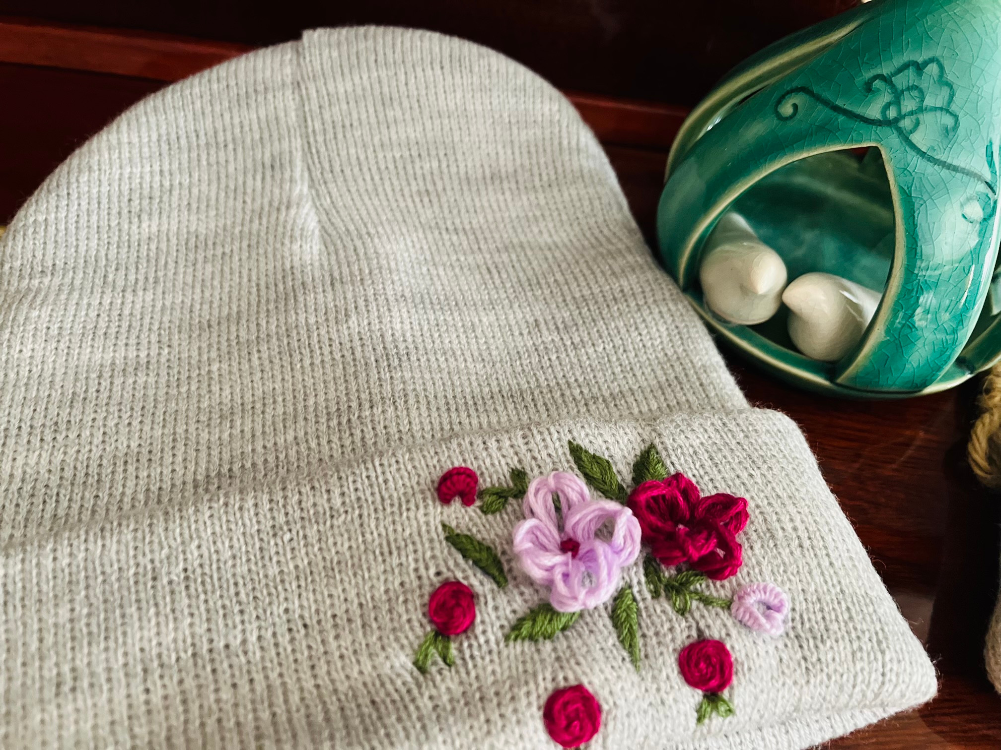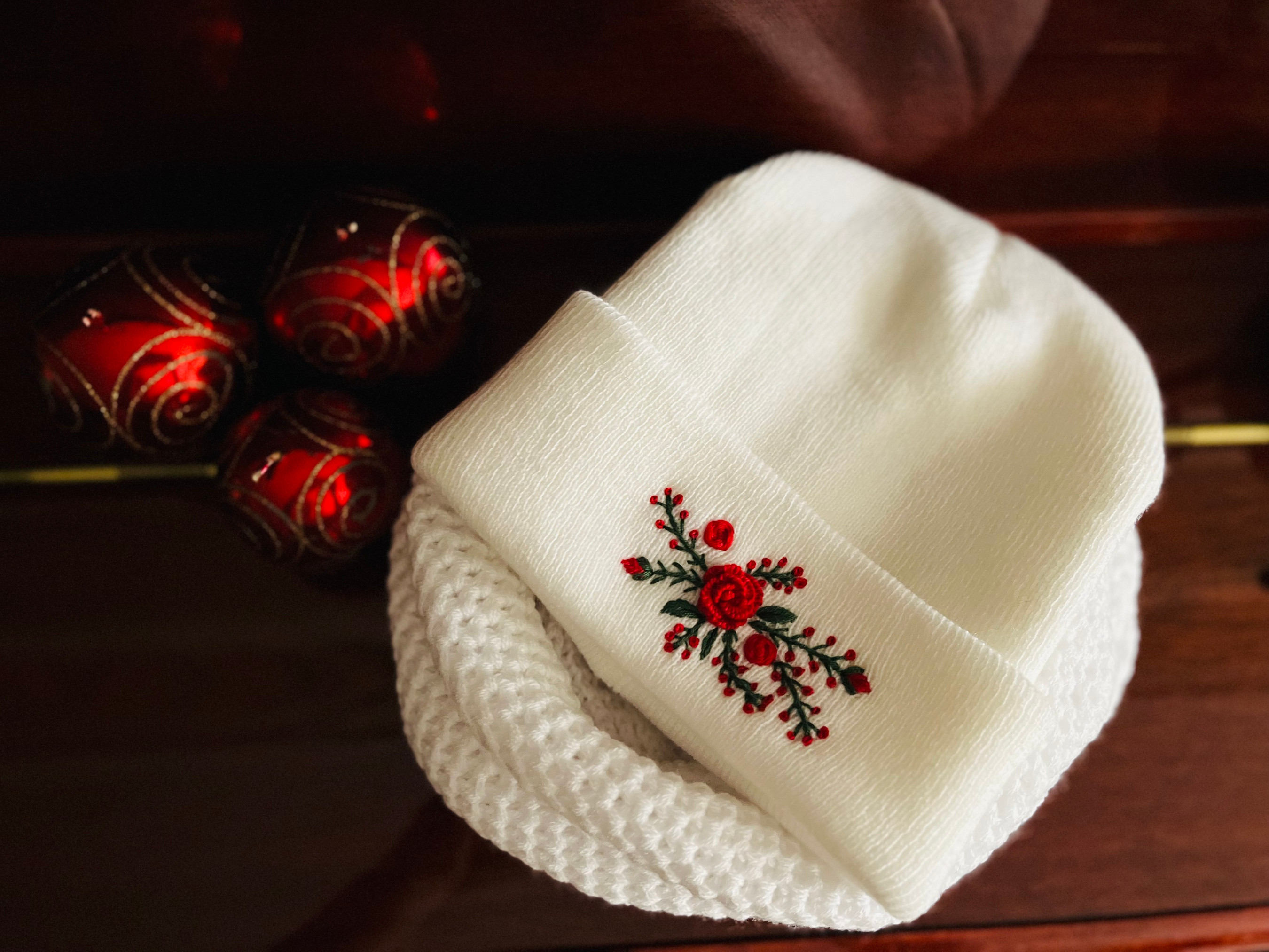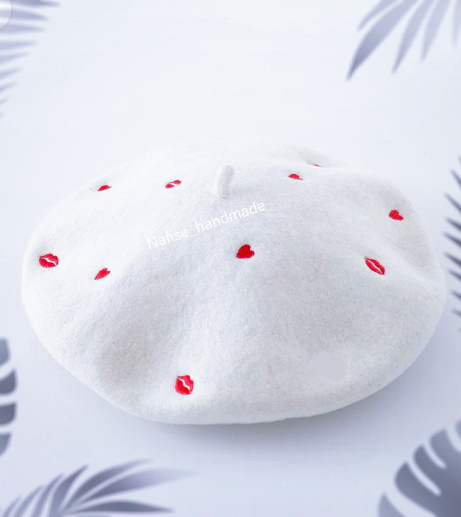 کلاه بافت موهر دستدوز با گلدوزی گل رز قرمز۶۰۰٬۰۰۰ تومان